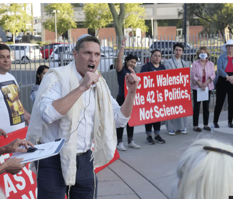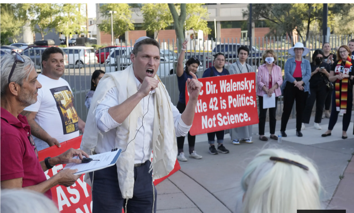 Rabbi Shmuly Yanklowitz speaks during a rally for asylum seekers outside the ICE offices in Phoenix on March 22, 2022. They are demanding the Biden Administration end Title 42 and stop holding asylum seekers illegally in Mexico.